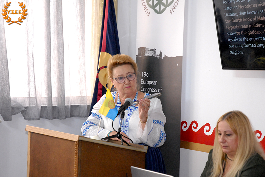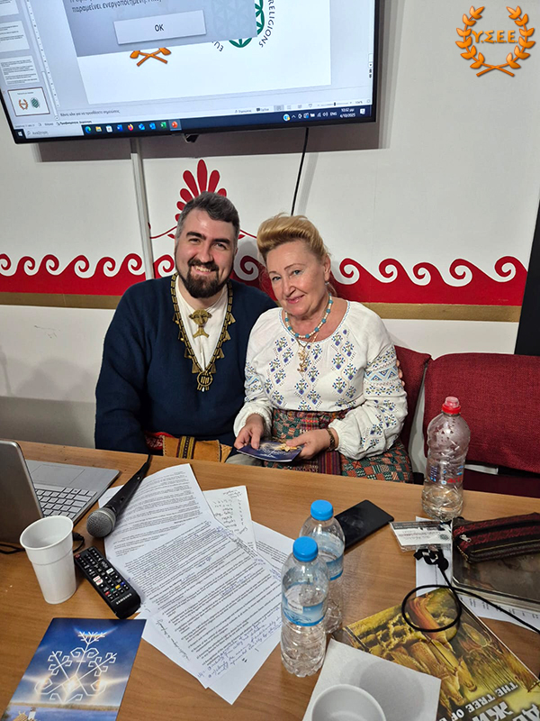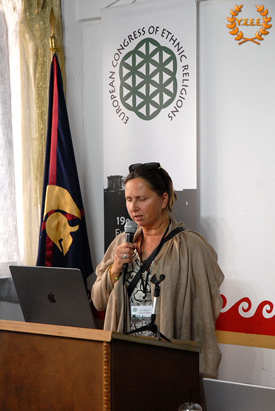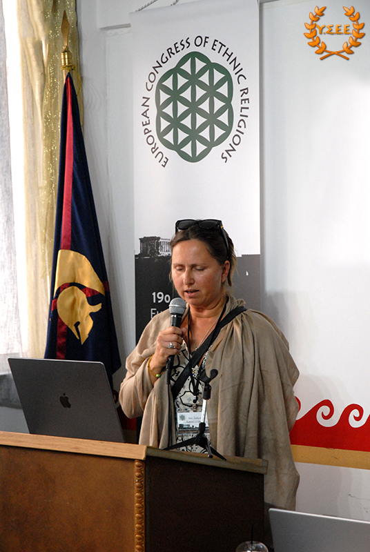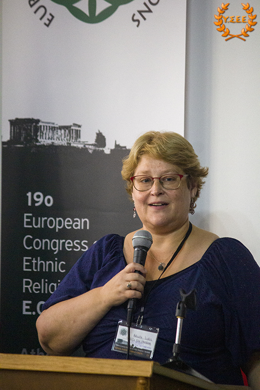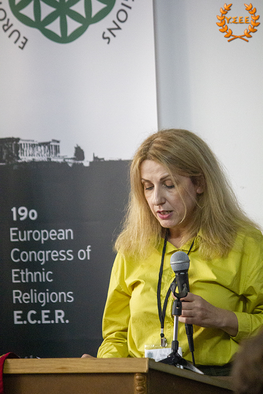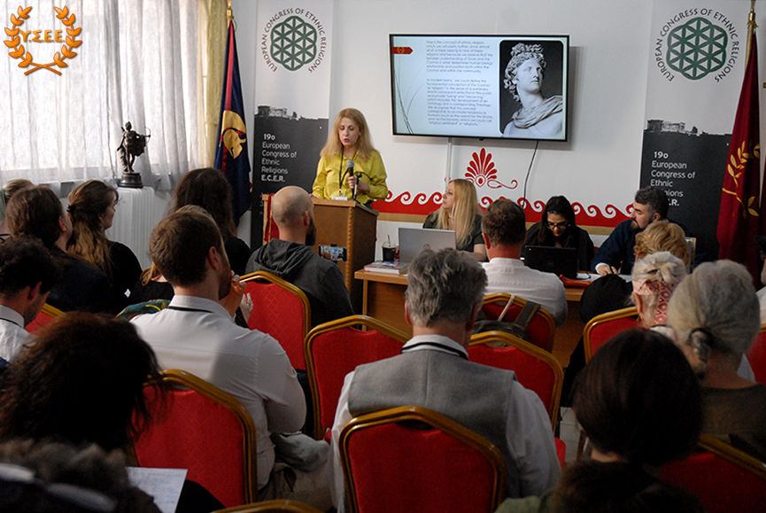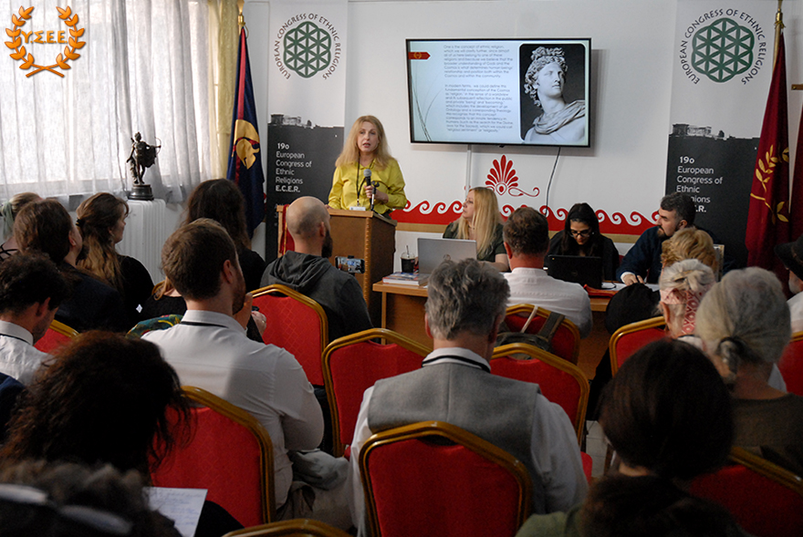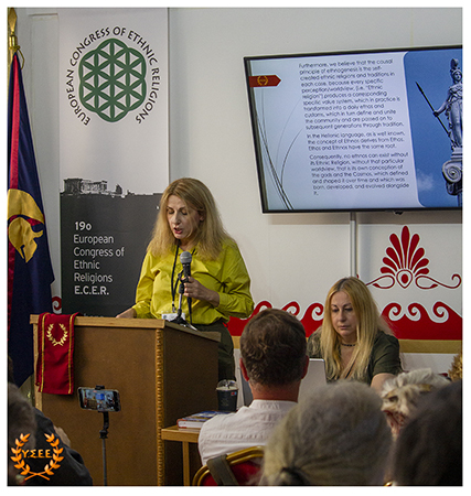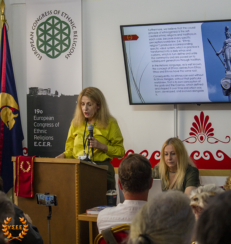 Next, Eleni Antigoni Xanthi, Priestess of the Hellenic Ethnic Religion and Member of the Board of Directors of the YSEE, stated in her presentation, among other things: «what constitutes European identity, common to all European citizens? Is it the distinctive features of a political entity such as the European Union, its institutions, the status of European citizenship that provides the possibility of free movement, residence, and work? Is it the common historical past of the peoples? Is it the sense of belonging to a specific geographical context? Is it perhaps the principles and values shared by European ethnic traditions?