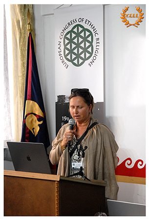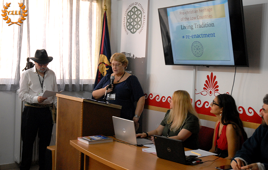 Immediately afterwards, Koenraad Logghe and Brenda Lioris from the Traditie organisation in Belgium took the floor, whose presentation reflected the views of the pre-Christian heritage of the Netherlands. Traditie, as Brenda Lioris emphasized, «is not a reenactment group. Our organisation Traditie goes to the heart of the matter and makes it into a way of life.»